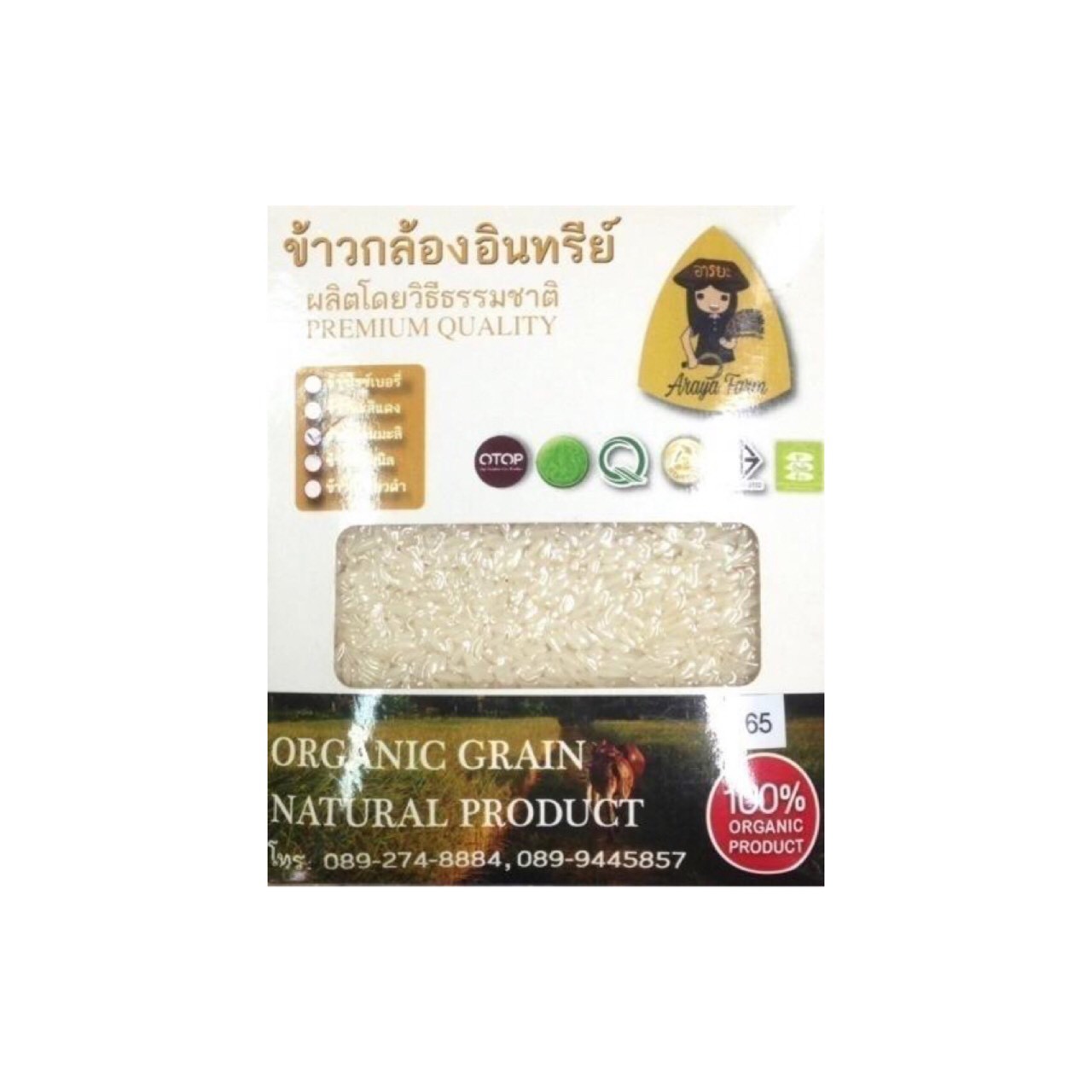 ข้าวหอมมะลิ105 อินทรีย์ ตราอารยะฟาร์ม ได้รับมาตรฐานการรับรอง คือ มาตรฐานการผลิตข้าวอินทรีย์